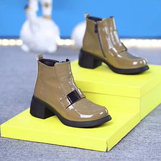 Vânzare2023秋冬新款时尚英伦风中跟防滑加绒短靴粗跟漆皮马丁靴女批发