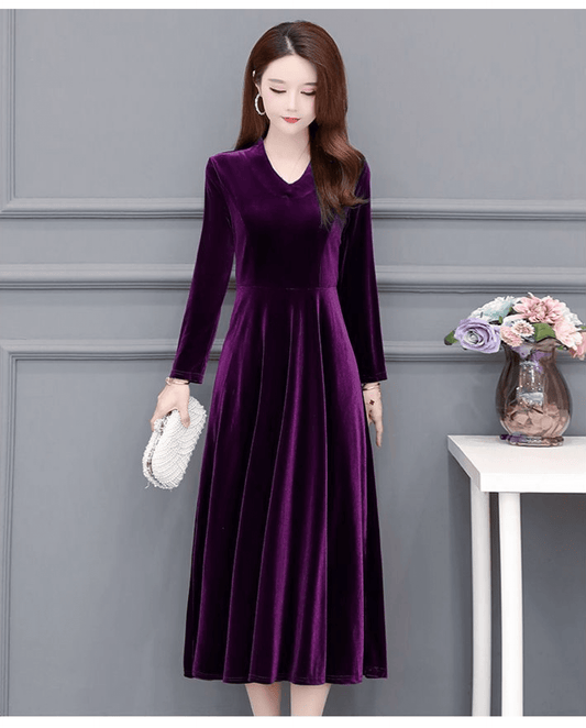 Noua rochie de moda cu decolteu in V din catifea aurie