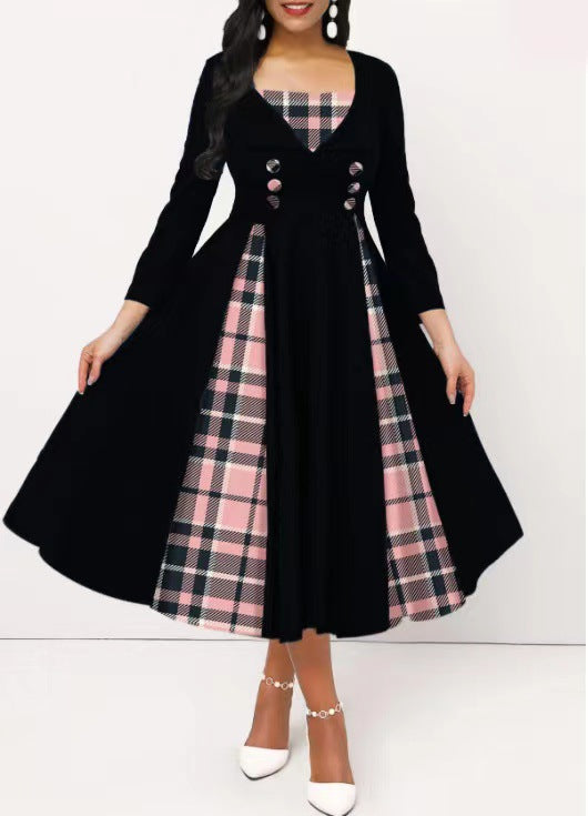 🔥ofertă limitată în timp🔥【S-5XL】♡2023 noua rochie in doua straturi cu cusaturi in carouri contrastante de toamna si iarna