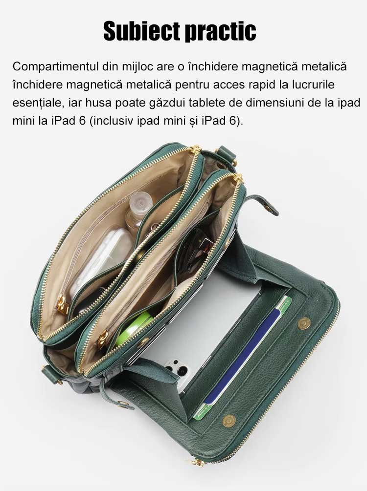 Nu pot să mă despart de această geantă! Este perfectă pentru a completa orice ținută, iar calitatea pielei și designul tristrat îi conferă un aspect rafinat și elegant.