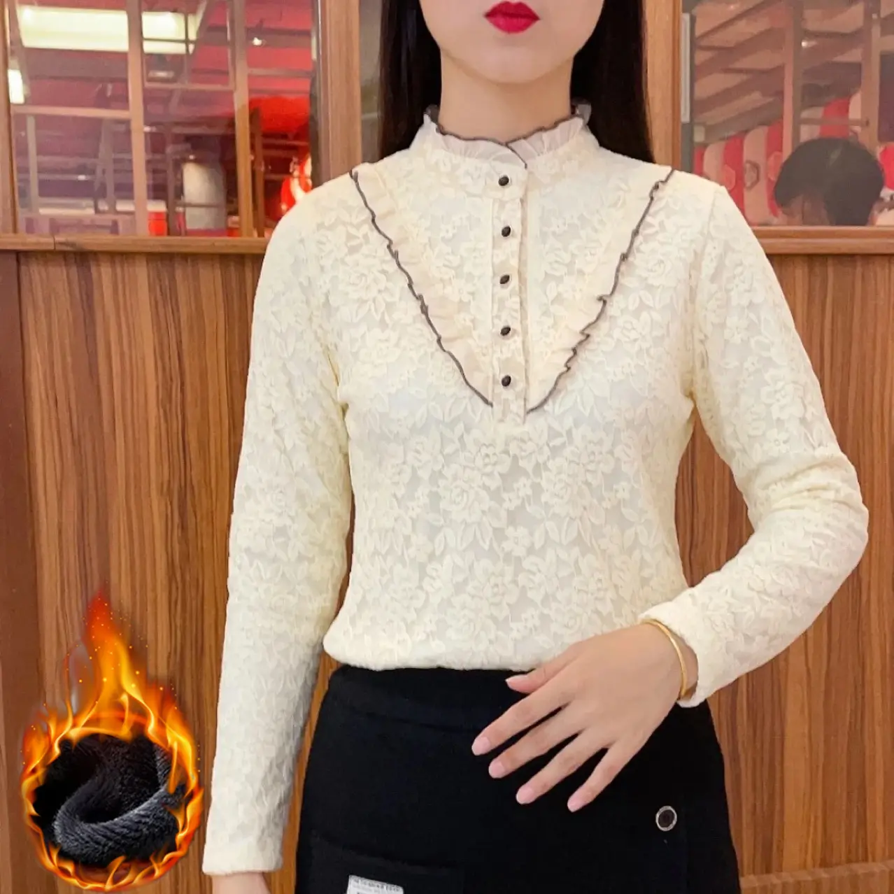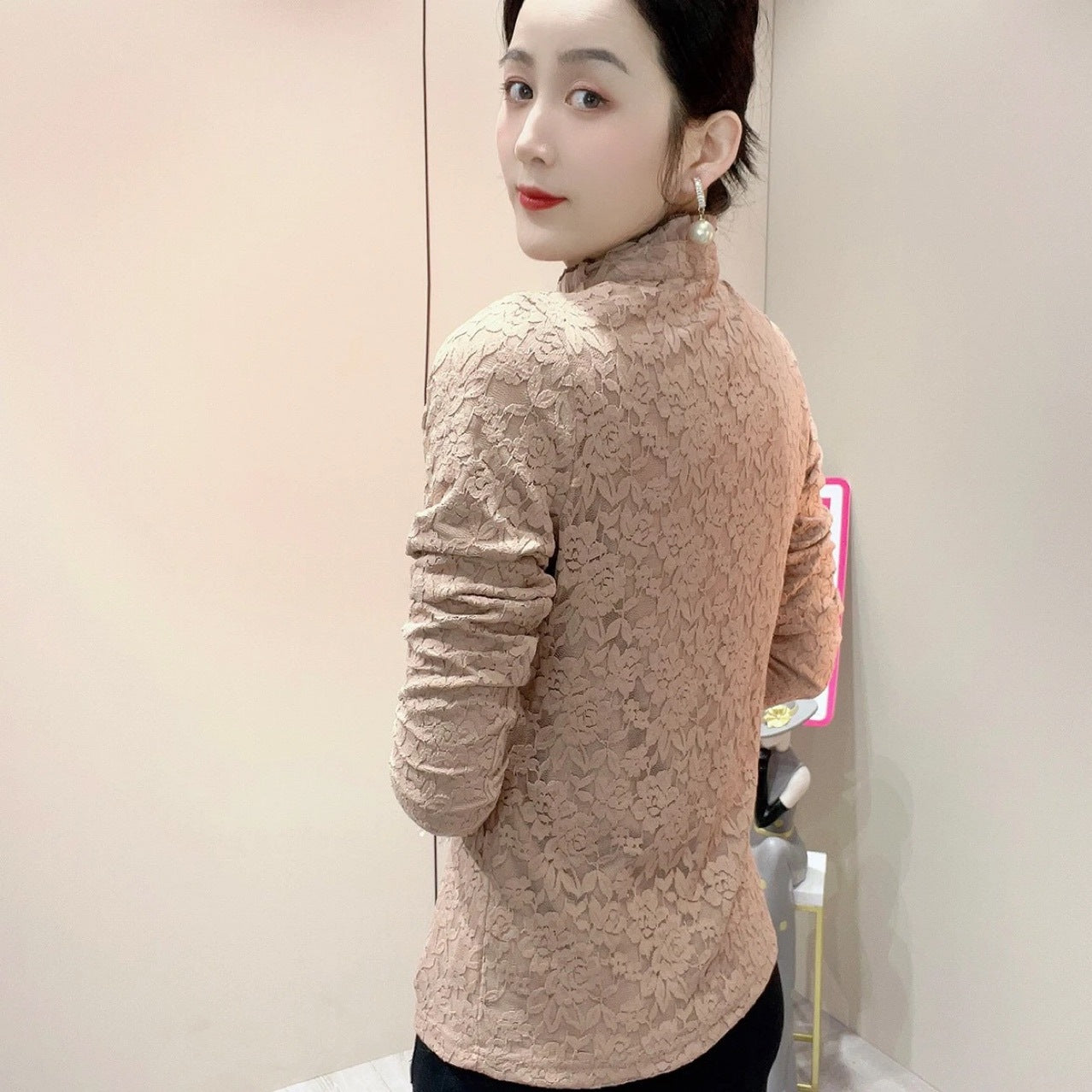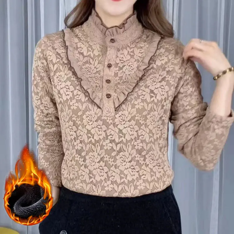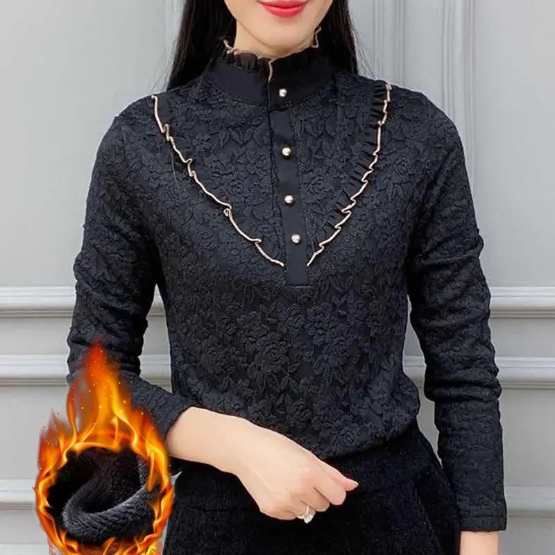 2023 Cămașă de damă, la modă, din catifea, îngroșată, din dantelă, cu gâtul țestoasă