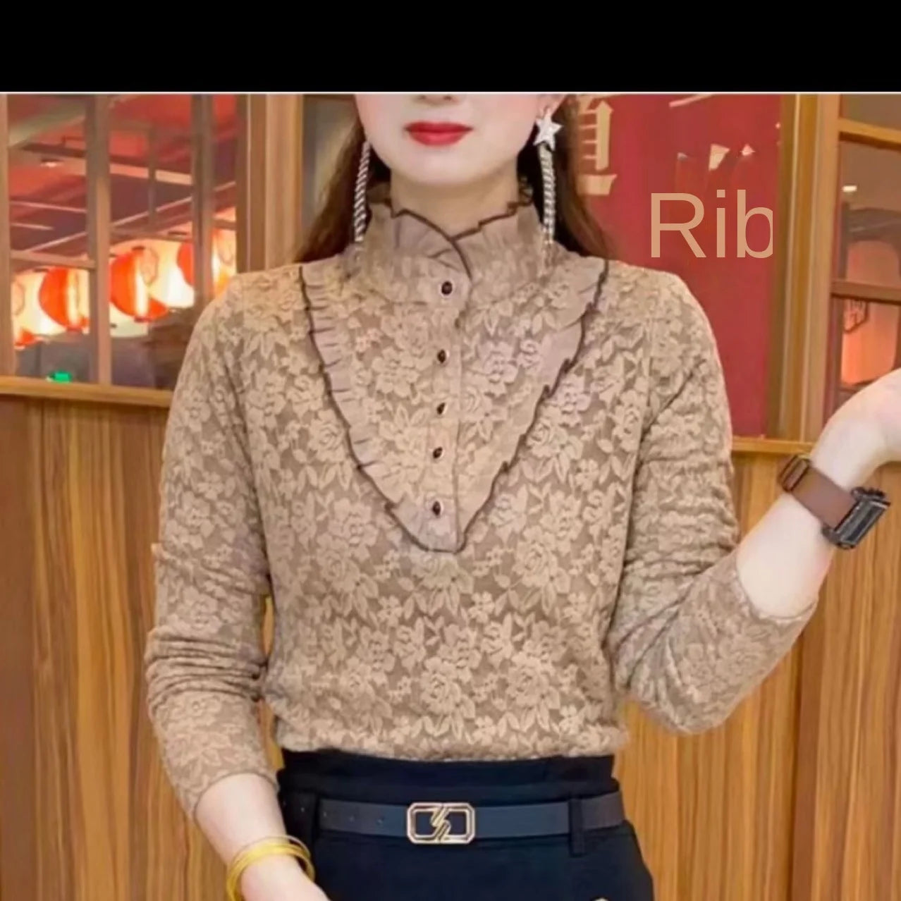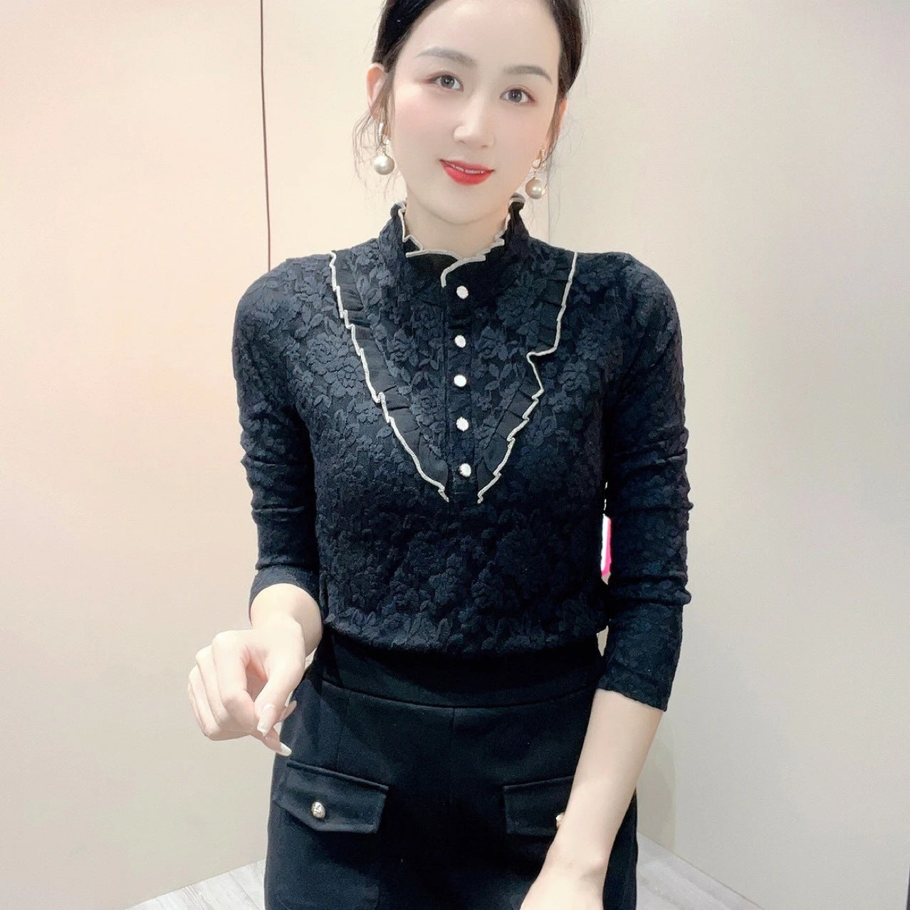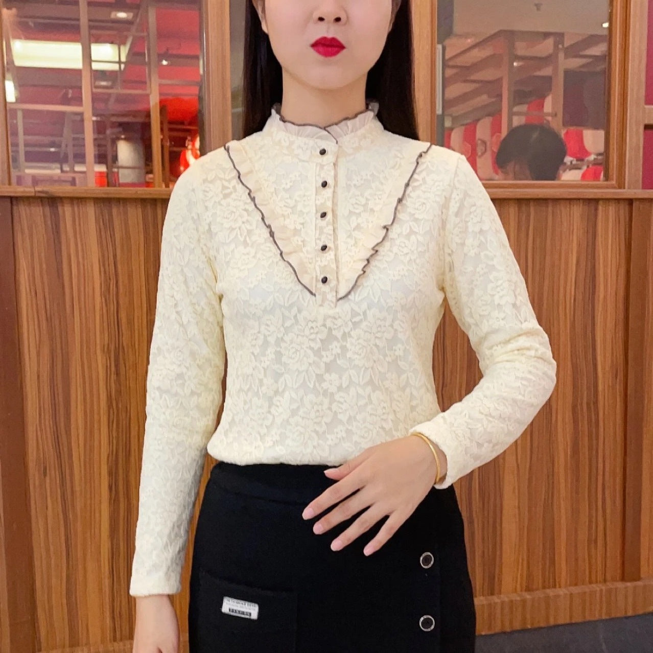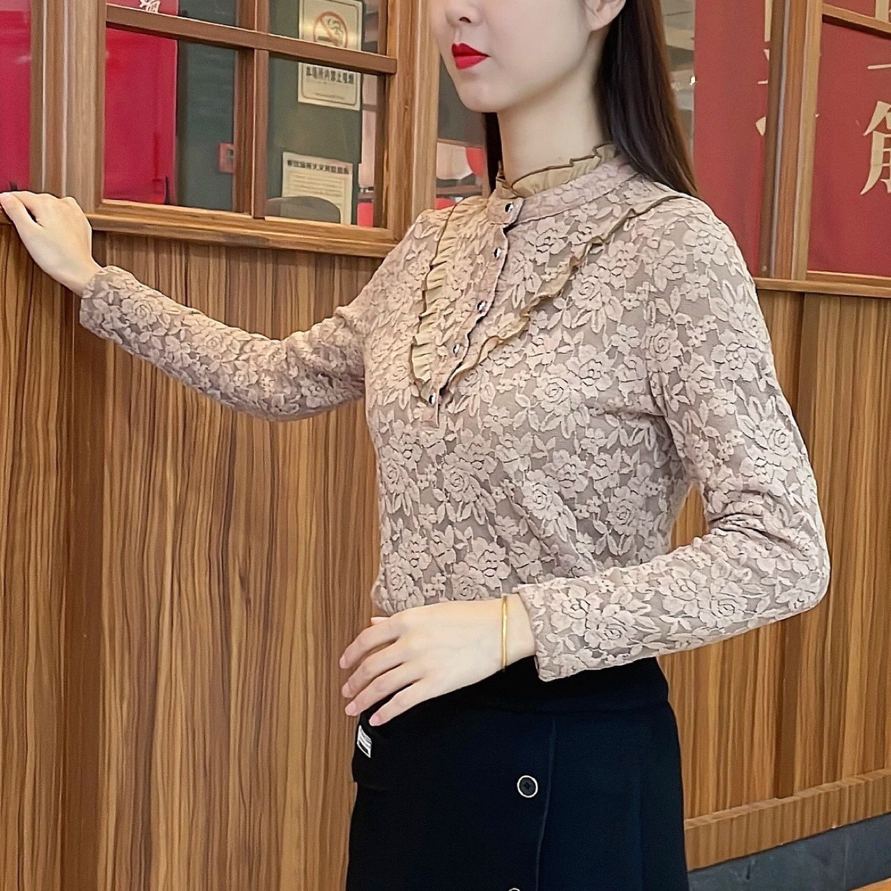 2023 Cămașă de damă, la modă, din catifea, îngroșată, din dantelă, cu gâtul țestoasă