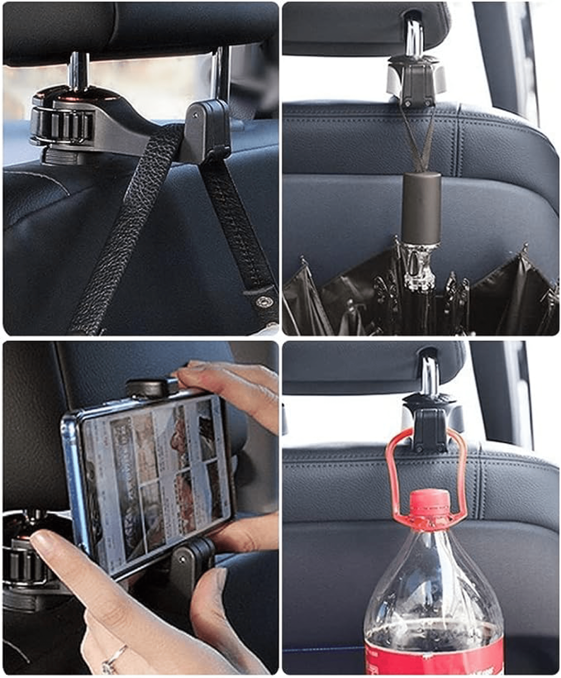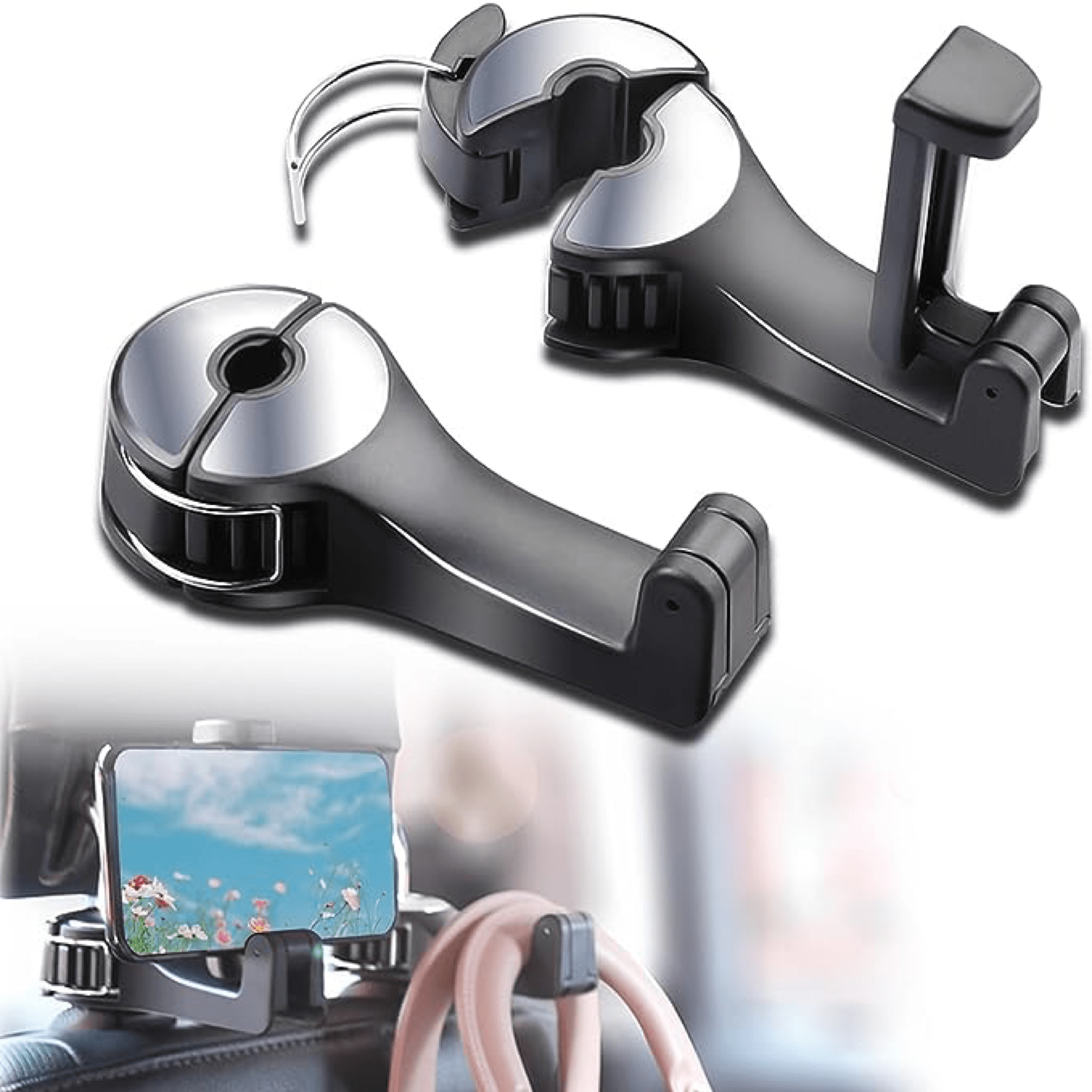 Acesta este cel mai bun cârlig pentru scaun auto pe care l-am văzut, nu ocupă spațiu și nu se rupe ca alte cârlige, este mic și puternic, dar flexibil și convenabil. Îmi pot agăța sacii de cumpărături, sticla de apă, telefonul mobil etc. și pot regla înălțimea și unghiul acestuia.